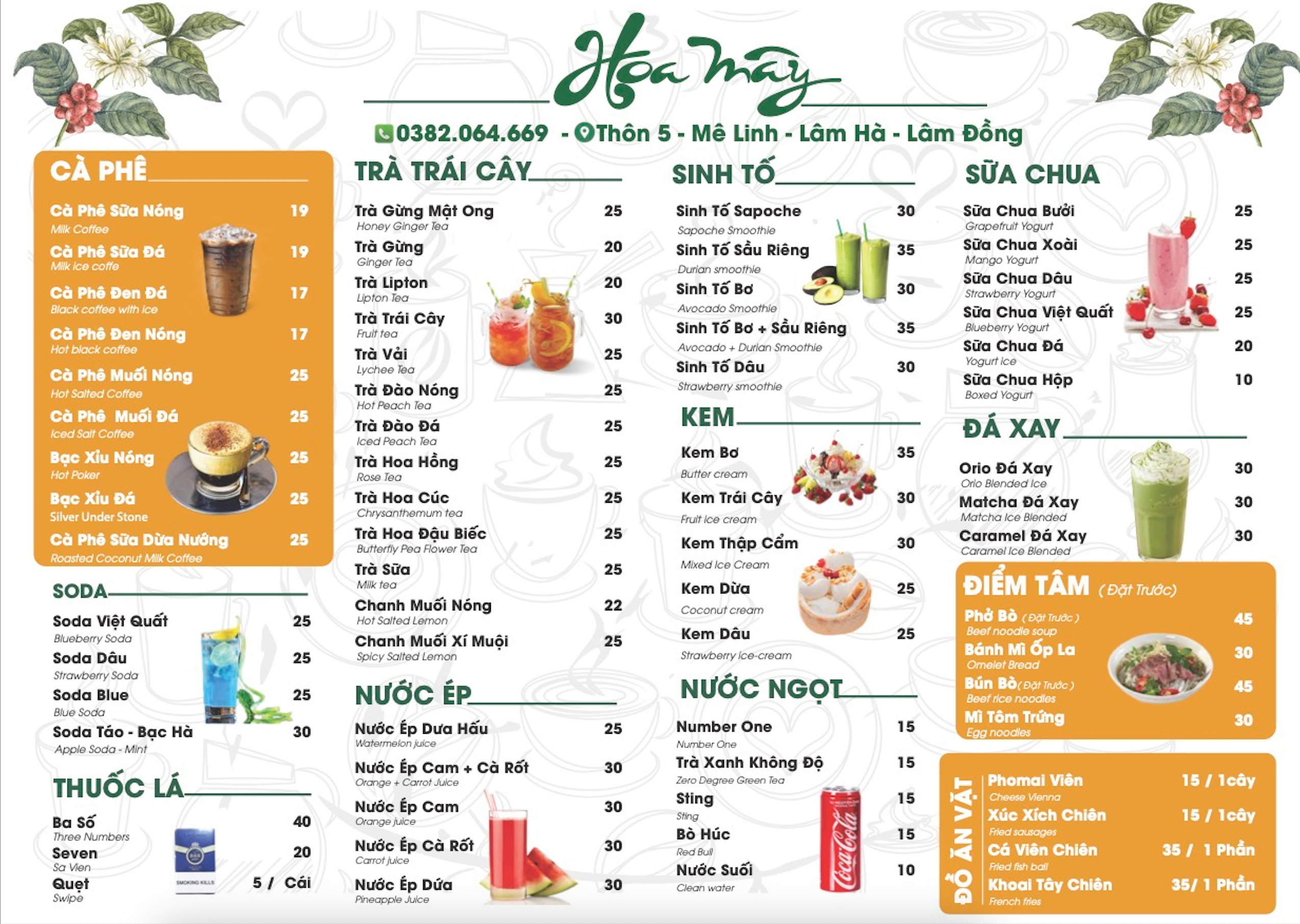 Our Cafe Our cafe has a wide range of drinks and Vietnamese food available for our guests and the general public. Enjoy a wonderful morning breakfast or relax with an afternoon coffee in our beautiful gardens. Our Menu
